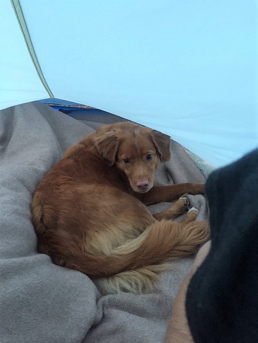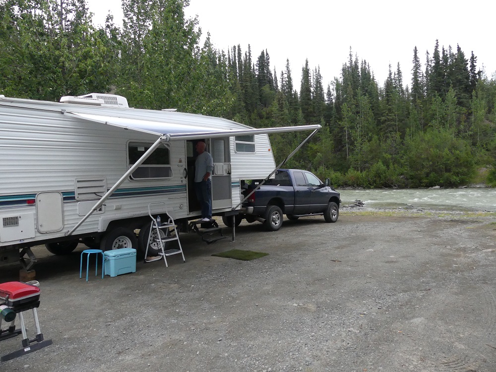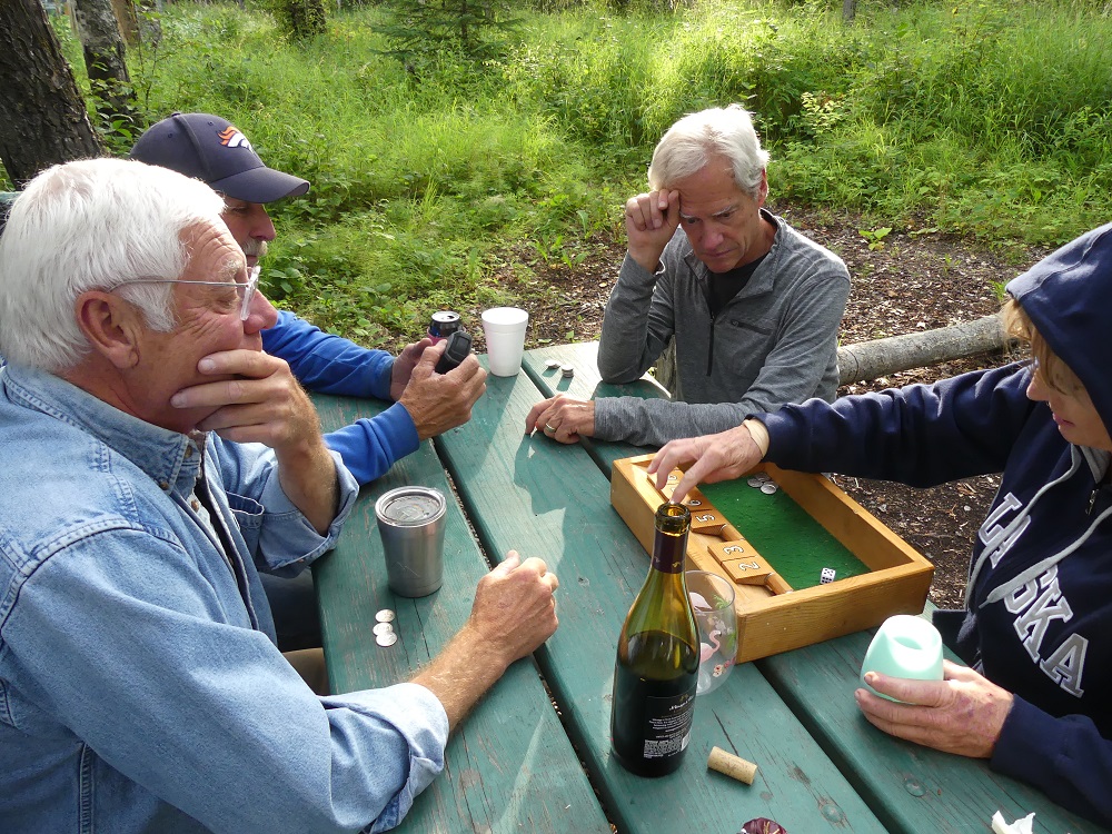 07/27/19 – Bob Dropped us off at a motel and after spending $140 for $60 quality room we hung around until approx 1:00pm when J&J came to pick us up and we went back to the Repair shop only to find out that the parts store had sent the wrong fuel pump and they had sent someone to Anchorage to pick up another and were not expected back until 4:30pm. We hung out at the Lake Lucile Park where Bob and J&J were camped, toured the Headquarters of the Iditerod Dogsled Race, took some walks, and played some games. We went back to the repair shop at 5:00pm to find the Camper still on the Rack and only one person at the shop washing the tow trucks. We grabbed some sheets and blankets out of the RV and spent the night in Bob’s little 2 man tent as we could not see overspending on another hotel room. I think Sierra is wondering what is up with these crazy hoomans who keep downsizing her accommodations. House to RV to Hotel Room and now a 2 man (+1 dog) tent. The rain was steady last night but the temperature was not too cold, and the tent kept us fairly dry until morning when it began to seep in around the base. Not bad for a 20 year old tent.