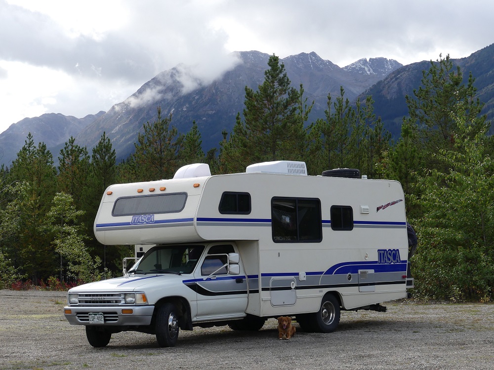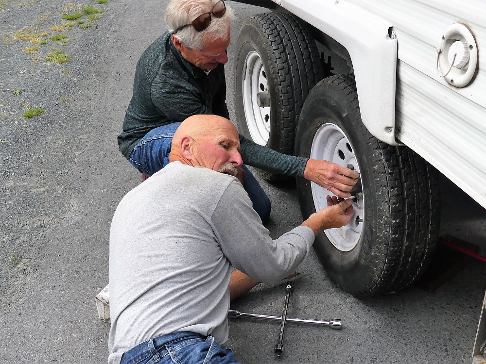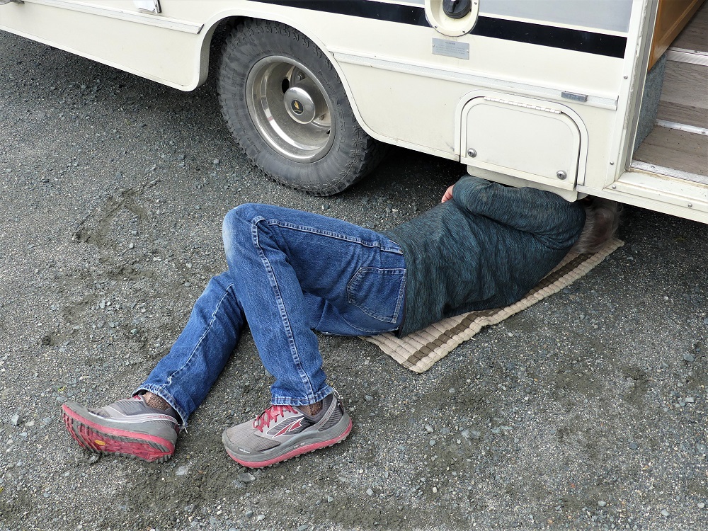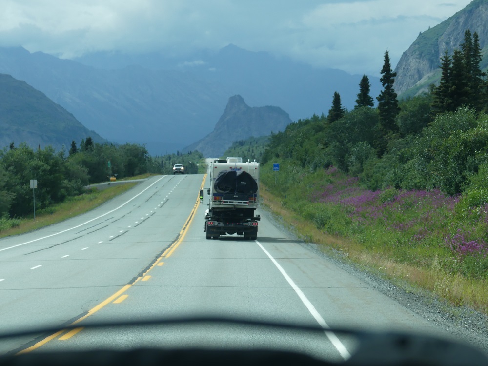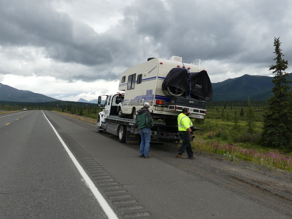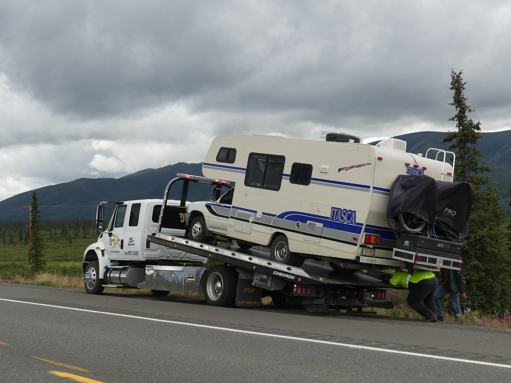 07/26/19 – Well, It looks like we have pushed all of our vehicles just a bit too hard on this trip and they are all finally complaining. I noticed water leaking out of Bob’s truck in Valdez. Jimmy also noticed he had a possible fan clutch issue on his Truck as well as having to purchase a couple of tires for his trailer due to irregular wear. We joked that the only vehicle that hadn’t had any problems was the oldest, our little Toyota RV. We should have known better than say anything! We had just left our beautiful little campground next to the Nelchina River and were headed to Eagle River outside of Anchorage, where Bob has arranged to have a new Radiator put in, when Jack, our Toyota RV, began coughing and sputtering and then quit completely. So much for our bragging rights. Fortunately Michael had the forethought to purchase towing insurance from Good Sam. We contacted them and they arrange a tow truck to come all the way from Wasilla, AK to take us to a mechanic. We waited approx 2 hours and Stan from Towz R Us showed up and put or Toy up on his Flatbed Wrecker and strapped her down. It was pretty spooky watching our little RV rocking and rolling over the frost heaved hwy on its way to the Repair Shop. We were taken to E.G.M. Auto Repair in Wasilla, home of Tiny the Tow Dog, where just getting the Toy off of the wrecker onto the lift was a challenge but the folks and E.G.M. were professionals. After placing the Toy on the lift, the mechanic reached down and turned the key and it fired right up! WTF!? He began by putting in a new fuel filter and took Jack out for a test drive. He had not gotten far when it quit again. So while we waited for another wrecker to bring it back to the garage, they ordered a new fuel pump that they will install tomorrow that will hopefully, solve the problem. Watching these folks work together was like watching a TV Reality show, what a bunch of characters. They told us we would not be charged extra for the entertainment.