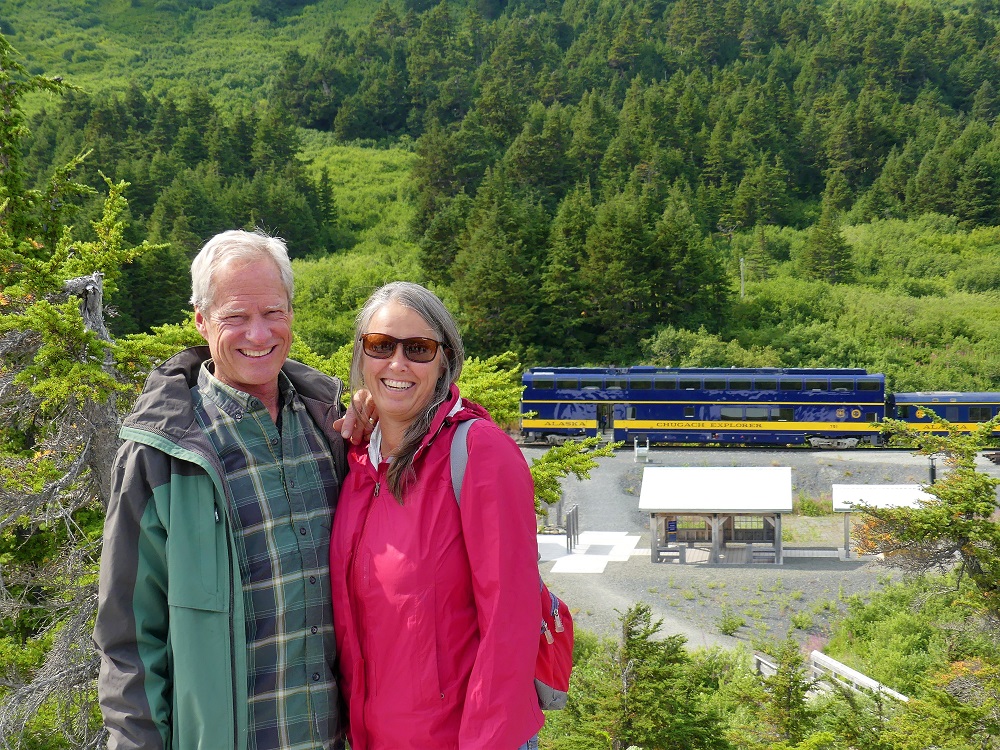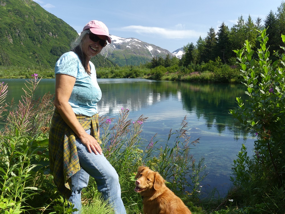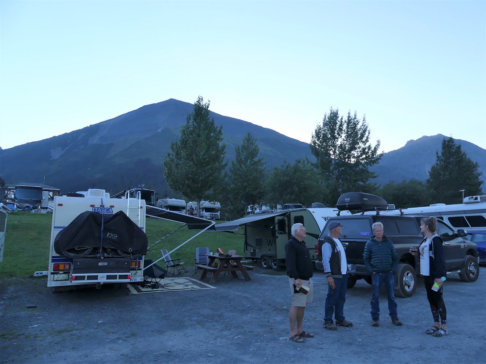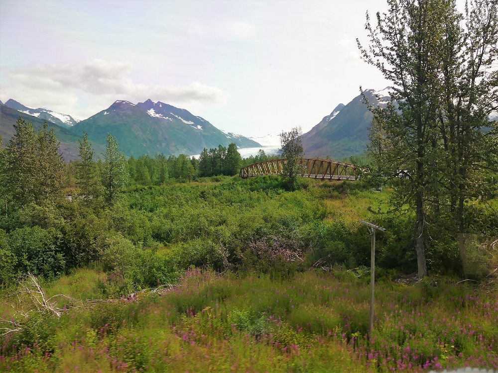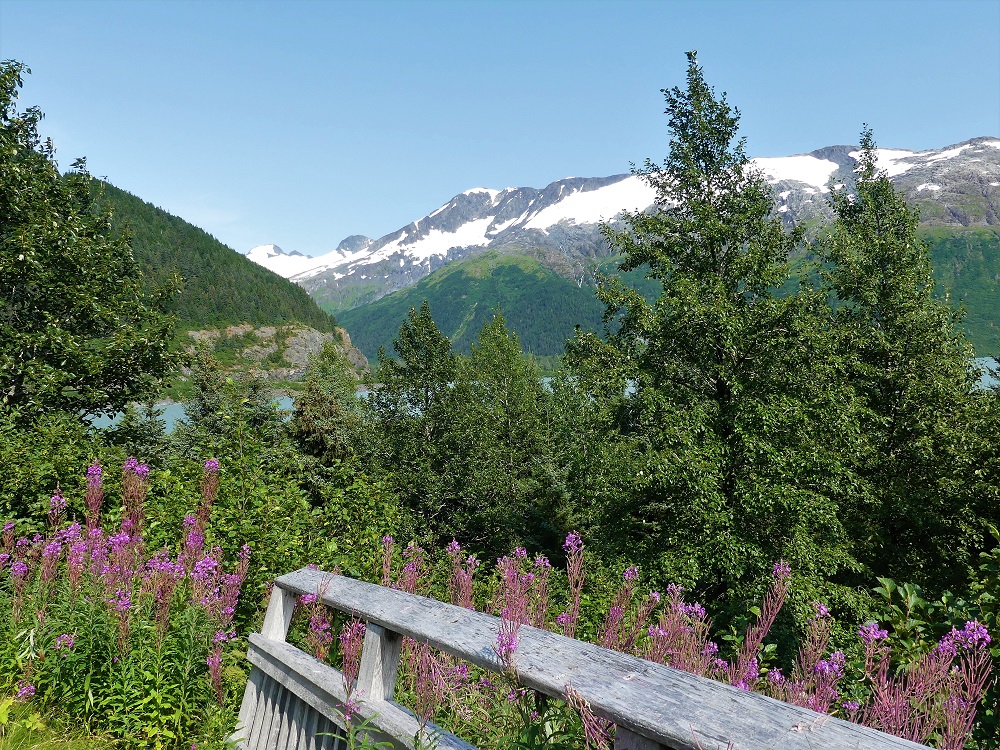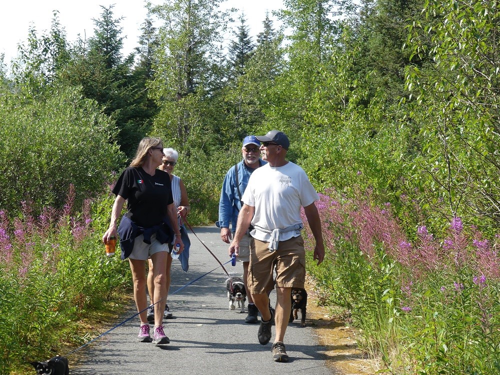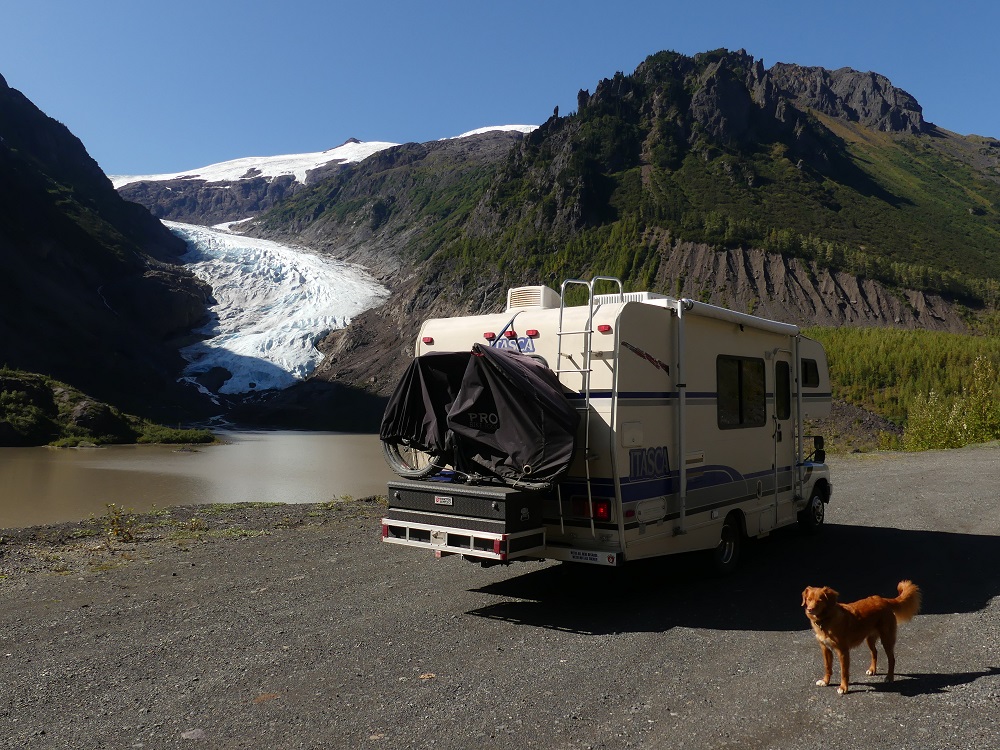 07/28 –08/02 Bob headed out early to get his Radiator repaired in Anchorage. J&J will be meeting with their friends Greg and Becky at an RV Park in Anchorage and we were headed to what we thought might be a campground on the outskirts of Anchorage called the Kincaid project but when we arrived we only found a large parking lot next to a dog park and a paintball park and no campground. We opted to drive down toward the town of Whittier as there are a couple of USFS campgrounds that offer good bicycling and hiking opportunities. We were delighted to find the wonderfully maintained, clean, paved, and spacious sites at the Williwaw campground. It has a Salmon viewing platform over the Williwaw creek which we checked daily and finally saw some red sockeye salmon swimming upstream to spawn. There were numerous nature trails to hike and bike on. With his new radiator in place, Bob joined us a few hours later. We rode our bikes and made plans to ride the Alaska railroad on a day trip out of Whittier, AK. J&J along with their friends, who came along for a day trip, joined us at the campground along with their 2 king Charles spaniels the next day. We all enjoyed a walk out to the Begich-Boggs visitors center on the Northwest Shore of Portage Lake. From this vantage point we could see 5 different glaciers surrounding us. The visitors center was very interactive and had many hands on exhibits and Audio, visual, cultural, and historical displays. It also had a beautiful and informative film on the natural history and culture of the area. As the filmed ended the screen lifted in the theater and a curtain opened to windows looking out over a stunning view of the lake and glaciers. Very well done! We really liked all this area had to offer and so kept extending our stay. We rode out bikes out to Moose Junction (no moose) and then picked up Sierra and gave her a run on the trail out to Byron Glacier. On our final day there, we loaded up our Camper, aka the party bus, with all 5 of us and 2 dogs and made the drive through the longest train/single lane vehicle tunnel 2.4 miles through the mountain to the deep water port of Whittier where we spent some time exploring the town. We left the dogs in the camper and boarded the train for the round trip scenic ride back through the tunnel and through the mountains past Spencer Glacier. At our turn around stop at Grandview station we paused for a bit to stretch our legs and pick wild blueberries. We did not have much luck seeing wildlife but did enjoy the ride and the scenery. Upon arriving back in Whittier, the Dogs were happy to see us and we made our way back through the long tunnel for the 4th time to the Willwaw campground. We all agreed this was a wonderful place to call home for a few days.