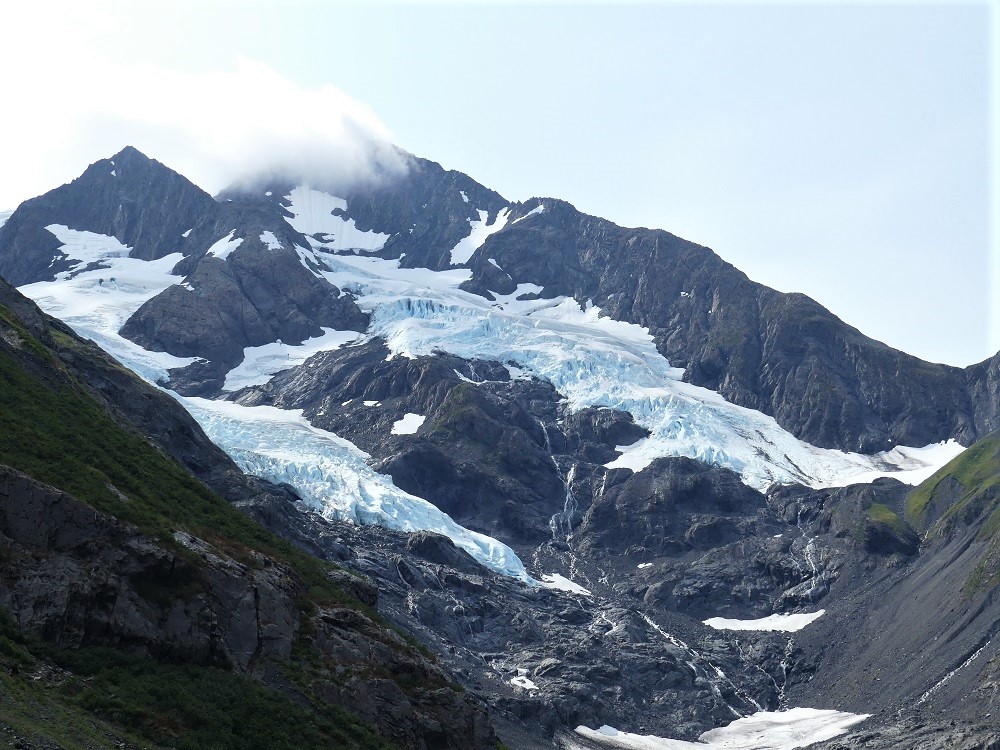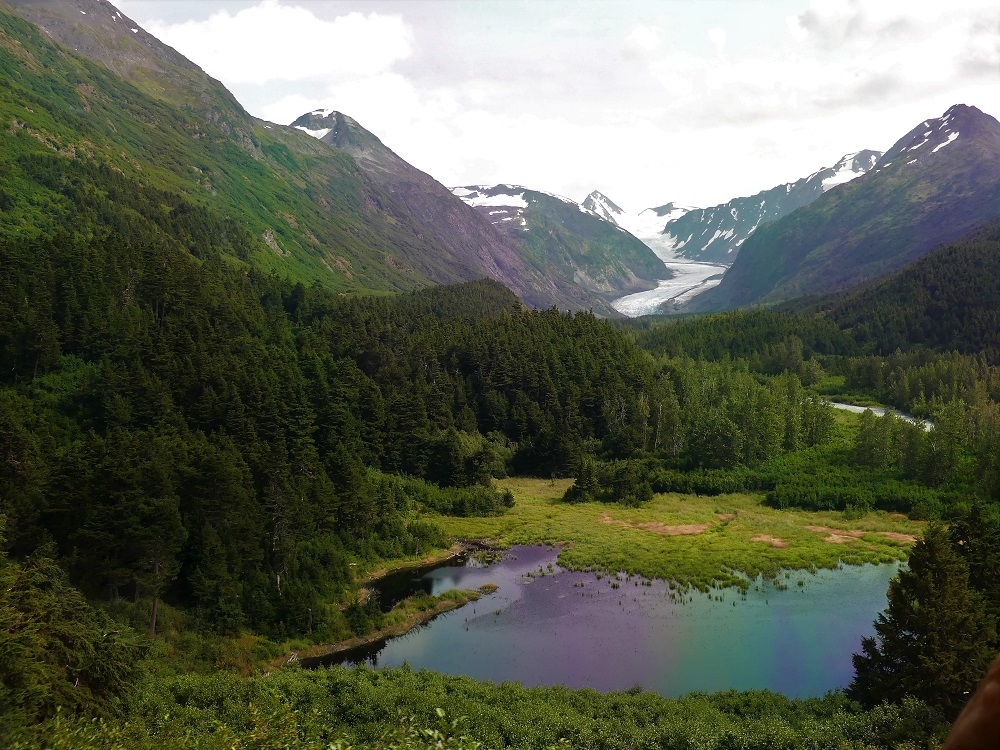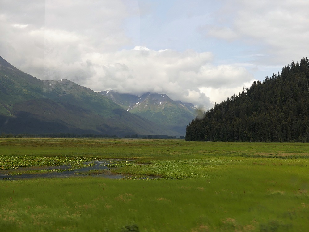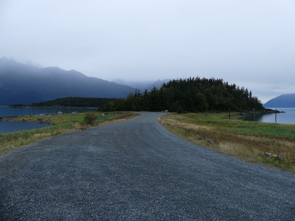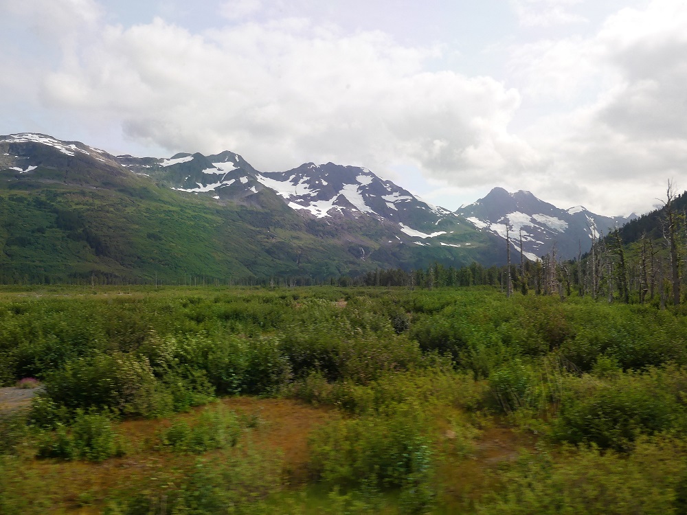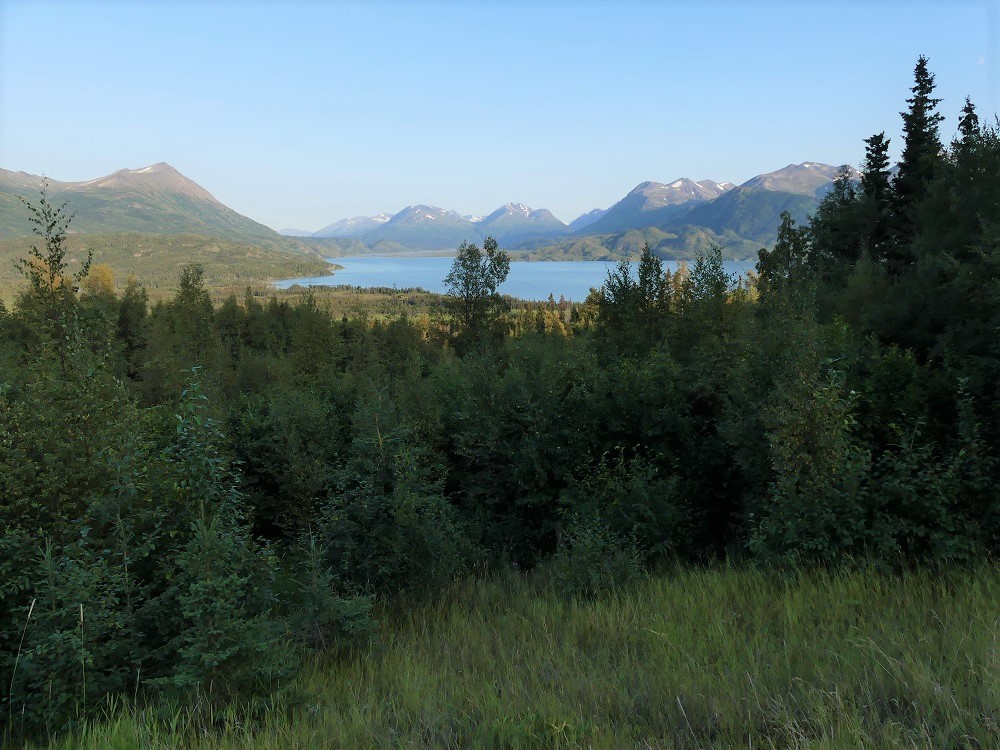 07/28 –08/02 Bob headed out early to get his Radiator repaired in Anchorage. J&J will be meeting with their friends Greg and Becky at an RV Park in Anchorage and we were headed to what we thought might be a campground on the outskirts of Anchorage called the Kincaid project but when we arrived we only found a large parking lot next to a dog park and a paintball park and no campground. We opted to drive down toward the town of Whittier as there are a couple of USFS campgrounds that offer good bicycling and hiking opportunities. We were delighted to find the wonderfully maintained, clean, paved, and spacious sites at the Williwaw campground. It has a Salmon viewing platform over the Williwaw creek which we checked daily and finally saw some red sockeye salmon swimming upstream to spawn. There were numerous nature trails to hike and bike on. With his new radiator in place, Bob joined us a few hours later. We rode our bikes and made plans to ride the Alaska railroad on a day trip out of Whittier, AK. J&J along with their friends, who came along for a day trip, joined us at the campground along with their 2 king Charles spaniels the next day. We all enjoyed a walk out to the Begich-Boggs visitors center on the Northwest Shore of Portage Lake. From this vantage point we could see 5 different glaciers surrounding us. The visitors center was very interactive and had many hands on exhibits and Audio, visual, cultural, and historical displays. It also had a beautiful and informative film on the natural history and culture of the area. As the filmed ended the screen lifted in the theater and a curtain opened to windows looking out over a stunning view of the lake and glaciers. Very well done! We really liked all this area had to offer and so kept extending our stay. We rode out bikes out to Moose Junction (no moose) and then picked up Sierra and gave her a run on the trail out to Byron Glacier. On our final day there, we loaded up our Camper, aka the party bus, with all 5 of us and 2 dogs and made the drive through the longest train/single lane vehicle tunnel 2.4 miles through the mountain to the deep water port of Whittier where we spent some time exploring the town. We left the dogs in the camper and boarded the train for the round trip scenic ride back through the tunnel and through the mountains past Spencer Glacier. At our turn around stop at Grandview station we paused for a bit to stretch our legs and pick wild blueberries. We did not have much luck seeing wildlife but did enjoy the ride and the scenery. Upon arriving back in Whittier, the Dogs were happy to see us and we made our way back through the long tunnel for the 4th time to the Willwaw campground. We all agreed this was a wonderful place to call home for a few days.