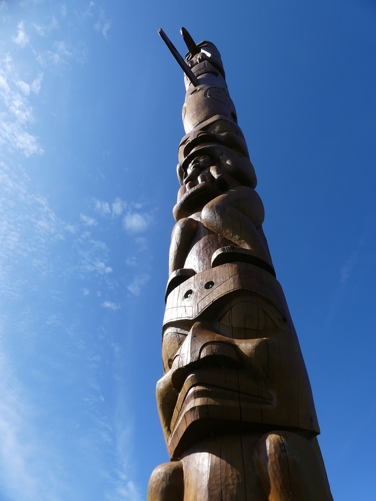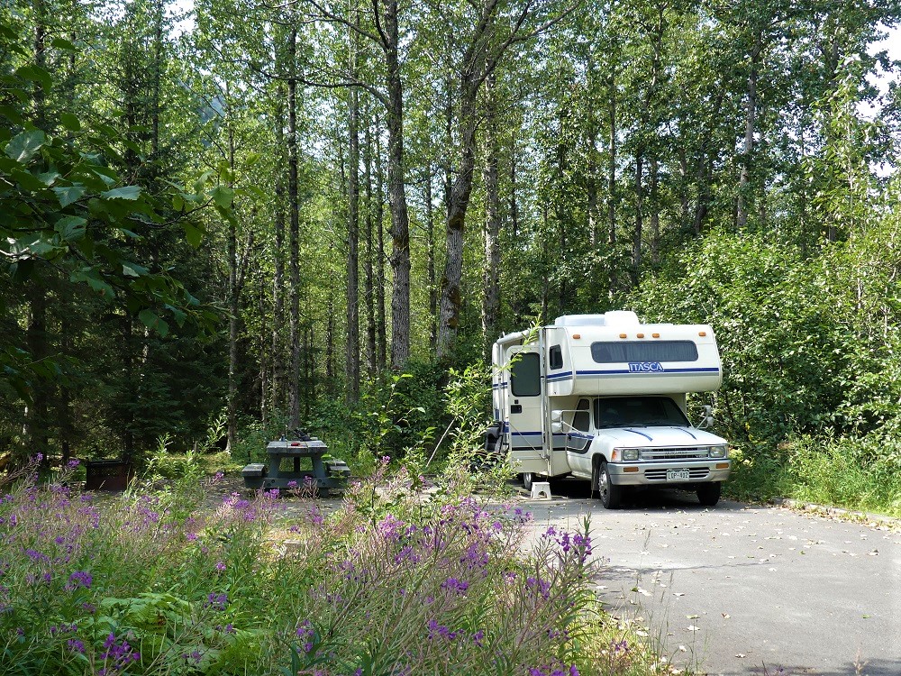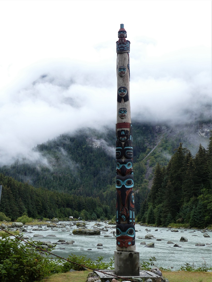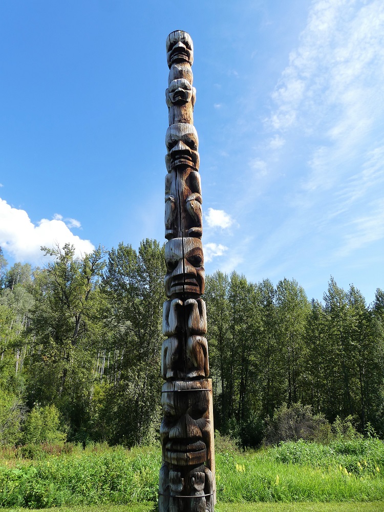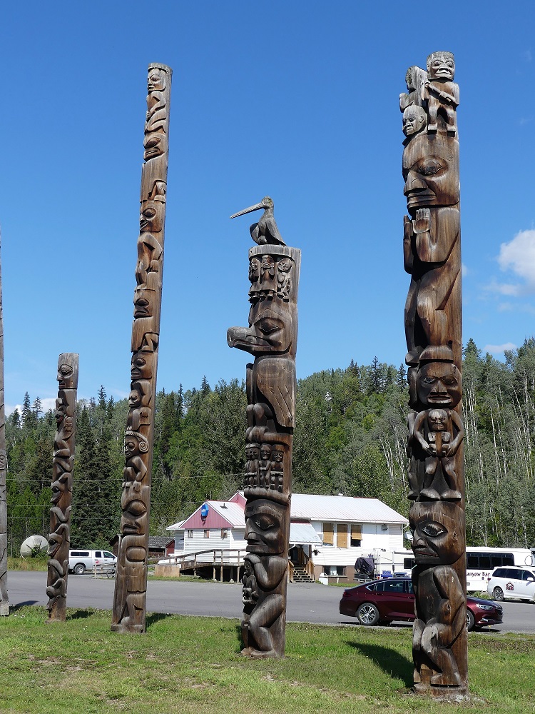 08/29 – 08/30/19 Towards the end of the Cassier Hwy we came across the town of Gitwangak or Kitwanga on the Map. It is the home of some of the oldest Totem Poles in Canada. These amazing carvings represent the different indigenous clans. We also stopped at a place called battle hill where Chief Nekt built a fortified village on top of this hill and would defend it by rolling spiked logs down on his enemies. We climbed the hill and were amazed at how many people were said to have lived in this village a the top of the hill as it did not seem that large. We drove on and finally made it to the end of the Cassier Hwy and found our way to a beautiful free campspot at Twin Falls Recreation Site outside of Smithers BC. This little area had beautiful trails and 4 level campsites with fire rings. We thought of our little caravan and how much Jim, Jackie, & Bob would have loved this site. We hiked up to the overlook of the falls and enjoyed a wonderful Scallop dinner cooked on the coals of the fire.