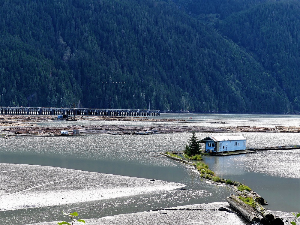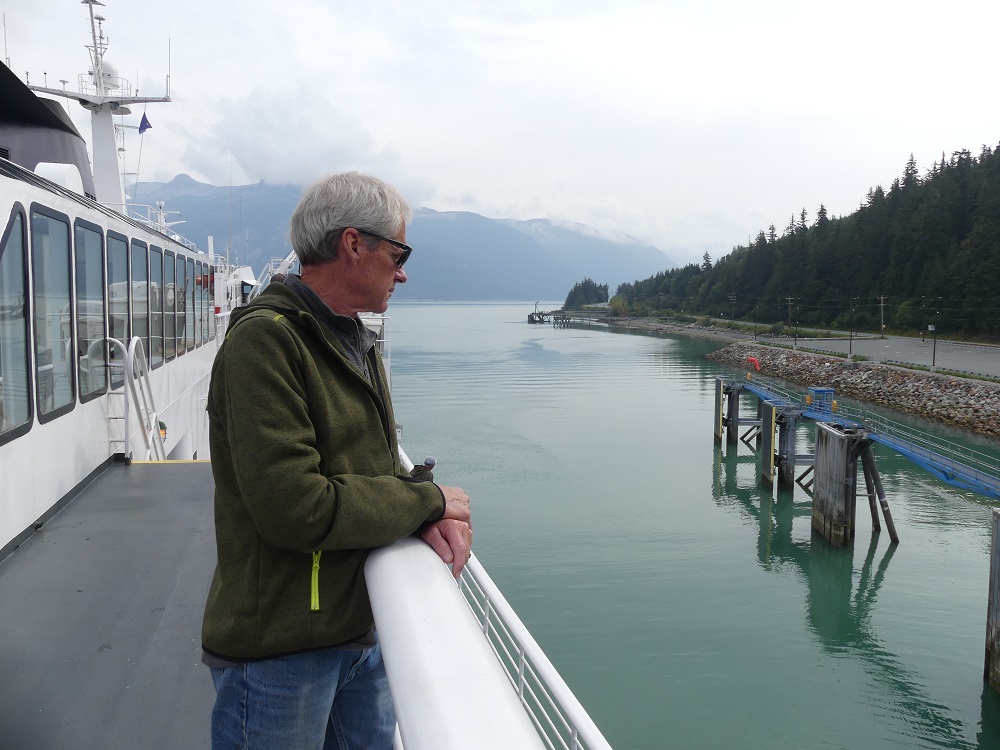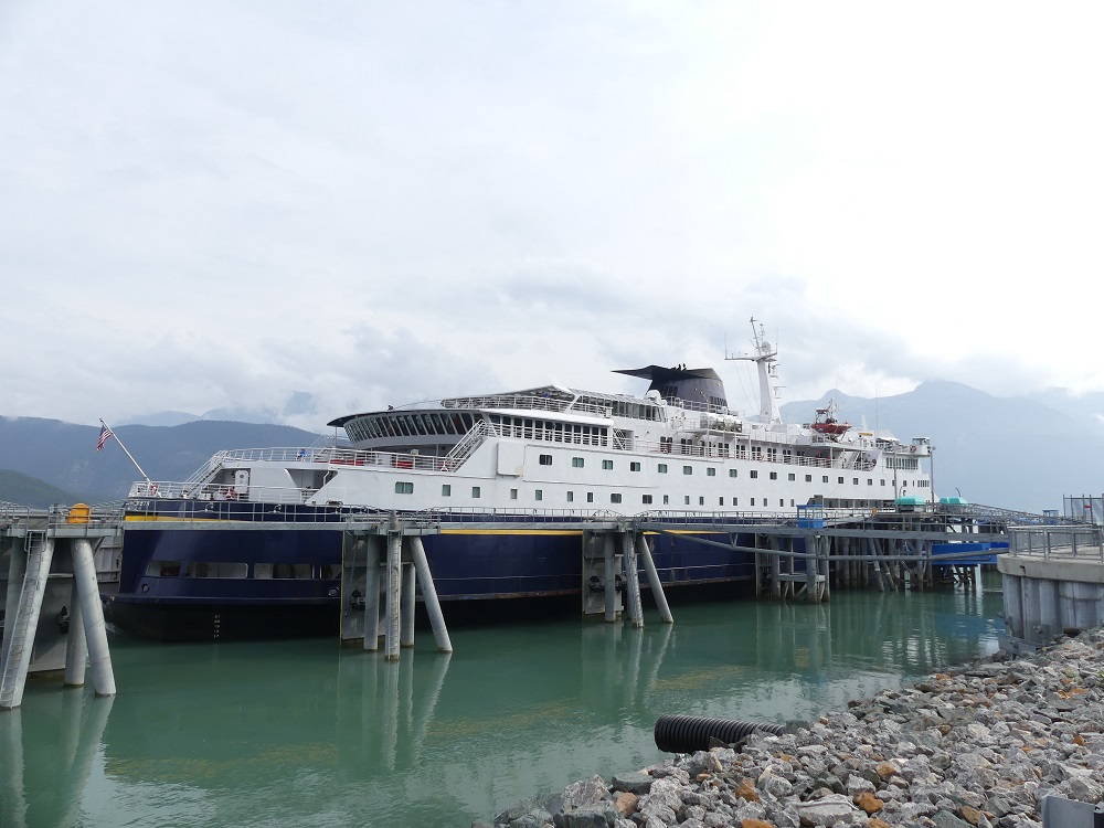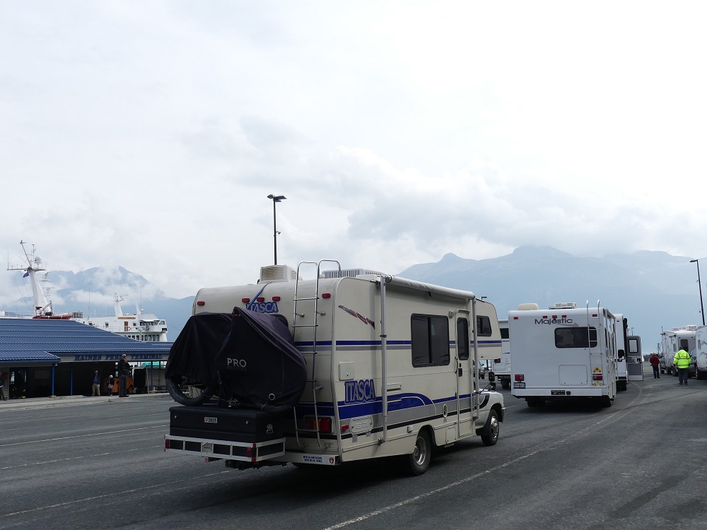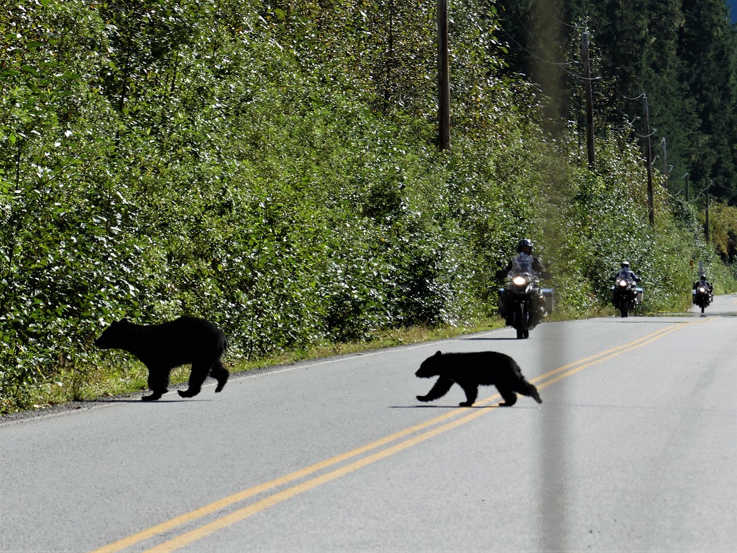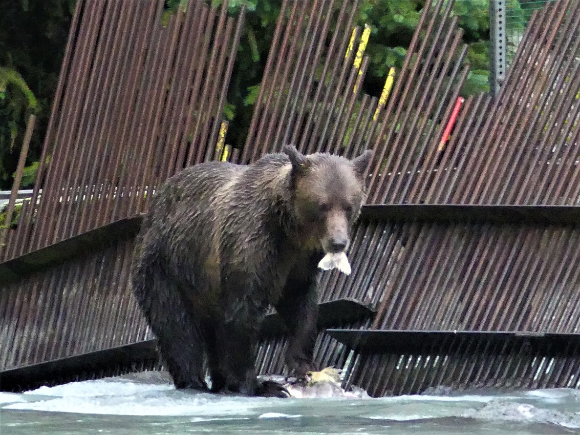 08/26 – 08/29/2019 We purchased passage on the ferry from Haines to Skagway in order to avoid having to backtrack. You know we couldn’t go on a trip without getting on the water at least once. While waiting in line for the ferry to begin loading the vehicles, I took Sierra for a last walk and ended up having to run to catch up with the Camper as it was pulling onto the ferry. We locked Sierra in the Camper and made our way up on deck. The ferry has cabins, showers, a café, numerous seating areas inside and out. There was a large solarium where many people gathered on lounge chairs and some folks even pitch tents on the deck using duct tape to secure them. The ride took just under an hour but it was nice to be back on the water even for a short ride. As we arrived in Skagway we saw three cruise ships docked and pulling off the ferry we found ourselves in a Disneyland like atmosphere with crowds of people wandering the streets and very little parking. We were finally able to find a parking spot and spent a few minutes among the crowds, gift shops and took a few pics, but feeling a bit overwhelmed we carried on north toward Whitehorse. and retraced our route back through part of the Yukon. We stopped a night at Squanga Lake Govt. Camp that had free firewood for our evening campfire. The next morning we continued on down to the Cassier Hwy 37. We found the Cassier to be in better condition than most of the Alaskan Hwy. As we traveled south we encountered a few black bears and moose enjoying the clover along the road. On the whole, We have seen more wildlife in Canada than in AK. We spent another night at Kinaskan Lake Provincial Park where we enjoyed a beautiful evening walk along the lake. The mushrooms were plentiful and the sunset over the water very pretty. Our Hyder destination is the most southern town in AK accessible by road. It is also known for Bear Viewing and we were still pumped about seeing bears from our time in Haines. As we drove Road 37A into Stewart, we passed quite a few large transport trucks carrying logs. The bay on the sister towns of Stewart, BC and Hyder, AK was full of floating logs waiting for transport. We camped down the road from the Fish Creek Wildlife Viewing area at Camp Runamuck where we caught up on laundry. We then went down and paid the fee to walk the boardwalk along fish creek where the chum and pink salmon were running so heavy you could almost walk across their backs. We enjoyed a wonderful halibut dinner at the Bus. And spent a couple of days visiting the viewing station but never saw a bear until we went to leave and saw one along the creek next to the parking lot and a mother and cub crossing the road down the way from the viewing station. Guess we really didn’t need to pay the fee but it goes to a good cause educating the public about the salmon, bears, and wolves of the area. We hit the bakery in Stewart on our way out of town the next morning and pressed on South.