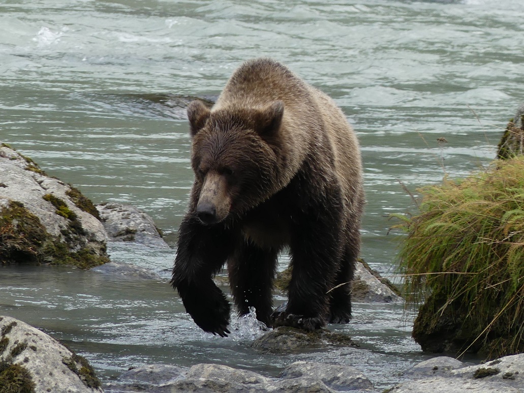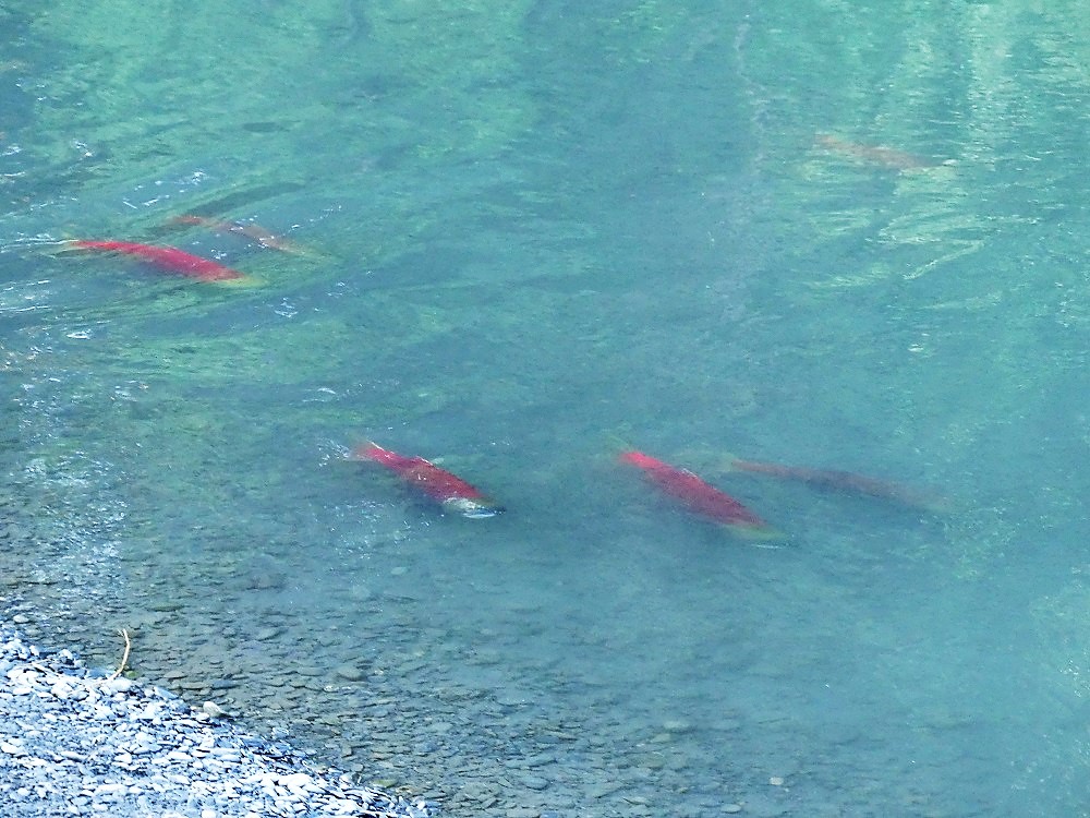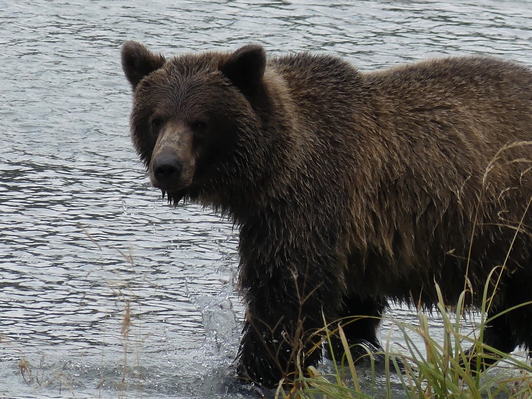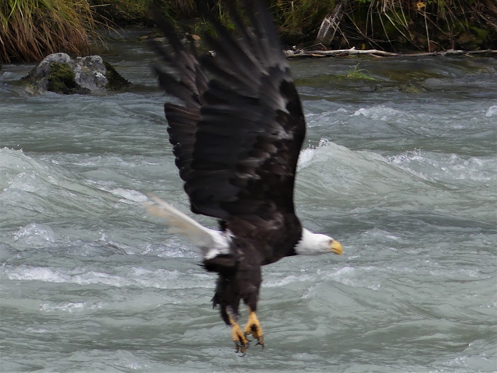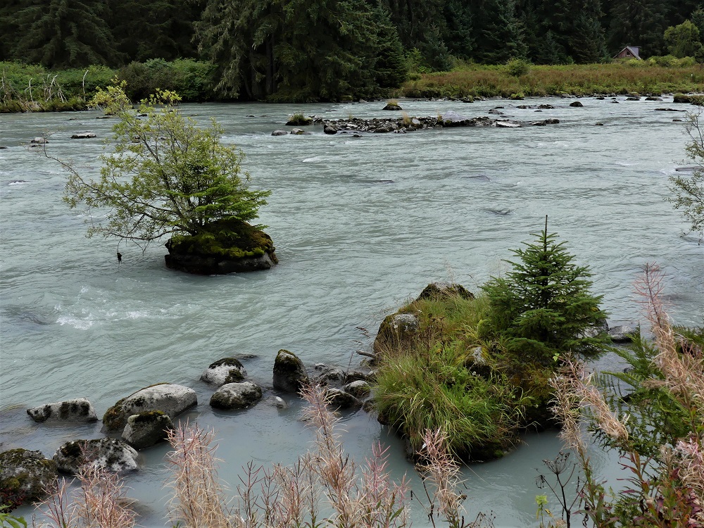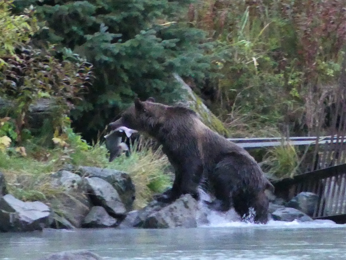 8/08 – 08/10/19 Traveling north to Cooper Landing where Jackie has friends she has been in contact with who have given us recommendations on things to do and places to fish. We camped at Quartz Creek Campground next to Kenai Lake. The campground had a very nice boardwalk that looked out over the Creek where we found a large number of Sockeye Salmon spawning. The area also seemed very popular with fly fisherman as well. We rode our bikes through the woods and took Sierra for a number of long walks and swims in the Lake. Jim and Jackie got to do some gold panning in this area and found a little color! We enjoyed a really good meal at the Sunrise Inn where Jackie’s friend works. She was really great and set us up with Lures we could use to do some “Flossing”, a way to catch salmon who do not eat when they are traveling upstream. We followed her suggestions and after a missed turn and a slight detour of about 10 bumpy miles we arrived at the location she suggested only to find new signs posted “No Fishing”. Not to be deterred we pulled off the road on our way back to the campground where we had seen some other people fishing across the river and proceeded to enjoy ourselves as we caught a few Coho salmon. We took a drive another day and hiked up to the Russian River Falls where we found a massive amount of Salmon at the base of the falls trying to make their way upstream. It is amazing to watch them make these really big leaps up the falls through rushing water and even more amazing is that many succeed. On the way back from our hike we stopped again at our same fishing spot. We were told by some other fishermen that showed up that there was a brown bear up the road fishing in the river. We hopped in the truck and headed that way. Mike was able to Snap a couple of pictures but I only caught his backside heading into the woods. (Seeing a Grizzly in the wild is still on my bucket list). We still have a ways to go and places to see. I am not discouraged.