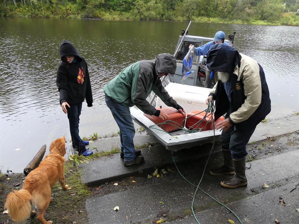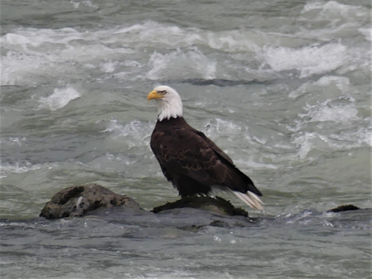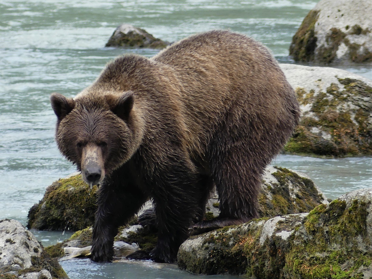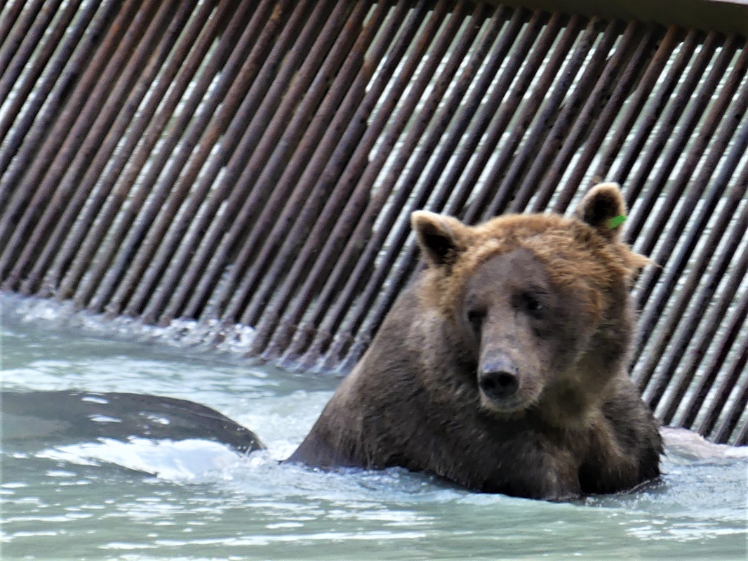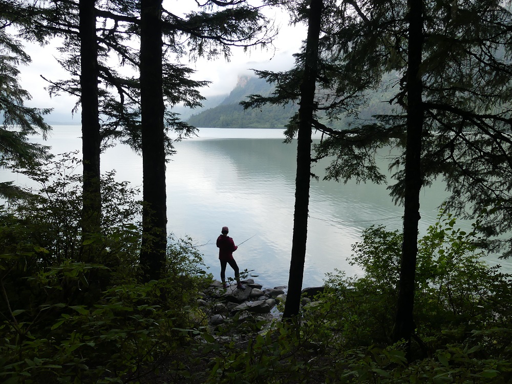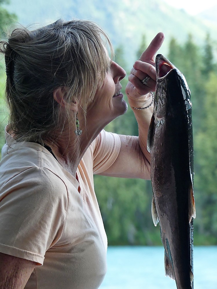 8/08 – 08/10/19 Traveling north to Cooper Landing where Jackie has friends she has been in contact with who have given us recommendations on things to do and places to fish. We camped at Quartz Creek Campground next to Kenai Lake. The campground had a very nice boardwalk that looked out over the Creek where we found a large number of Sockeye Salmon spawning. The area also seemed very popular with fly fisherman as well. We rode our bikes through the woods and took Sierra for a number of long walks and swims in the Lake. Jim and Jackie got to do some gold panning in this area and found a little color! We enjoyed a really good meal at the Sunrise Inn where Jackie’s friend works. She was really great and set us up with Lures we could use to do some “Flossing”, a way to catch salmon who do not eat when they are traveling upstream. We followed her suggestions and after a missed turn and a slight detour of about 10 bumpy miles we arrived at the location she suggested only to find new signs posted “No Fishing”. Not to be deterred we pulled off the road on our way back to the campground where we had seen some other people fishing across the river and proceeded to enjoy ourselves as we caught a few Coho salmon. We took a drive another day and hiked up to the Russian River Falls where we found a massive amount of Salmon at the base of the falls trying to make their way upstream. It is amazing to watch them make these really big leaps up the falls through rushing water and even more amazing is that many succeed. On the way back from our hike we stopped again at our same fishing spot. We were told by some other fishermen that showed up that there was a brown bear up the road fishing in the river. We hopped in the truck and headed that way. Mike was able to Snap a couple of pictures but I only caught his backside heading into the woods. (Seeing a Grizzly in the wild is still on my bucket list). We still have a ways to go and places to see. I am not discouraged.