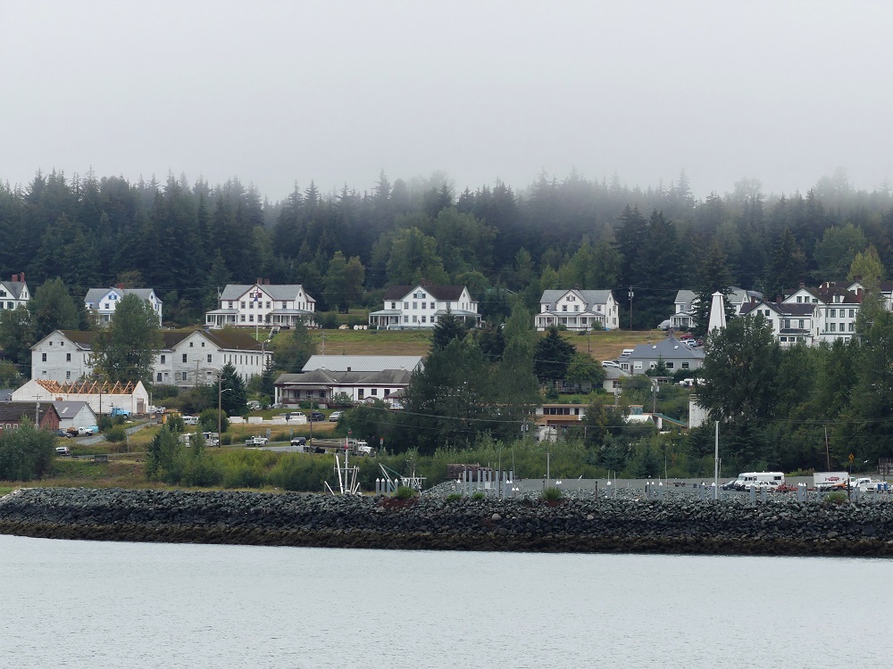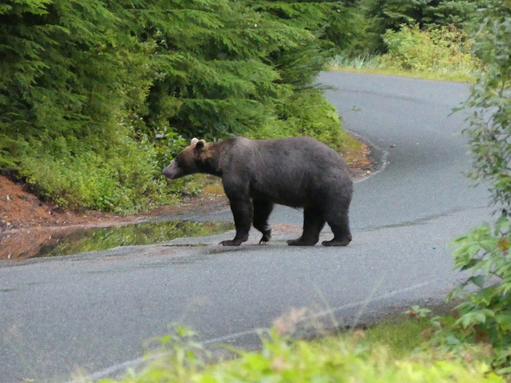 08/22 – 08-25/19 Time to head south and start making our way back down to the lower 48. After our adventure in the Interior of AK we spent the night in Fairbanks and another at Deadman Lake again. We decided to make our way down to Haines, AK and then hop the Ferry to Skagway. We stopped at the Welcome to AK sign to take a photo since it was early in the morning and not so crowded and busy as when we arrived. Better late than never. The scenery on the Haines Highway through the Yukon, BC, and back into AK was spectacular and different that anything we had seen previously. We pulled into Haines and stopped at the grocery store before heading to camp. Weather was a little cloudy and damp but we make our way out to Chilkat State Park where there was plenty of open camping spaces so we settled in and took Sierra out for a walk. I of course took the camera along just in case. Sierra and I walked down to the inlet and as we were walking back another camper told us there was a mother and baby moose making there way through the campground. He said he saw Mike trying to take pictures with his Phone. It was almost dark but I was able to get a couple of shots before my battery died. When I got back to camp, Mike said she and the calf had walked right through our campsite. Mike and I drove into town to check out the local farmers Market and saw the set of Dalton City that was constructed for the Disney movie White Fang. We enjoyed poking around the town of Haines, walking the Docks and driving around Fort William H Seward’s historic buildings. We heard there was another campground on the opposite side of the town beyond the Ferry Terminal where there was a fishing weir and where bears often congregated. After filling up with fuel we made our way out to Chilkoot Campground. We passed the weir on the way there and saw a number of people with long lenses….looks like we were in the right place to see the bears. We found a beautiful campsite right next to the lake and walked back down the road to the fish weir. The fish and game dept. monitors the fish that are passing through the weir and also helps to keep people and bears getting to close together. We were told that there had been a bear at the weir earlier but there were none on our first walk down. Walking back into camp we noticed a strong smell of gas. We looked under the camper a saw that the fuel tank was leaking. We drove the camper back into Haines to find a parts store and spent the next few hours working in their parking lot to seal the leak with some epoxy designed for just such an event. The patch seemed to hold and so we headed back to our camping spot. We met Holly and Terry who were also hoping to get some good photos and had been traveling specifically to destinations where they could view bears. We walked back to camp and were just finishing a game of cribbage when she stopped by our campsite to let us know that there was a couple of bears at the weir. I grabbed the camera and we made our way down and were able to get a few pics of the bears fishing and chowing down on Salmon. What a thrill! Getting a picture of a Grizzly bear in the wild was on my bucket list! Check!!! Over the next few days we enjoyed numerous walks to look for, and photograph the bears, wildlife and scenery. At one point all the fisherman on the river were bunched together on a island. We assumed correctly that there was a large bear close by and were able to get another bunch of great bear photos. We stopped off at the Haines Brewery and toasted our wonderful luck with a pint of Spruce Tip Ale. We also enjoyed one of the tastiest and beautifully presented meals of this entire trip at the Pilot Light Restaurant. I don’t usually take pictures of my food but couldn’t resist snapping a quick photo of my halibut tacos. While conversing with the waitress we learned that her family owns a restaurant near Hearst Castle, she gave us the name and we will definitely stop by when we travel down the California coast with Mom and Dad next month. We fell in love with the town of Haines and would love to return here someday for another visit.