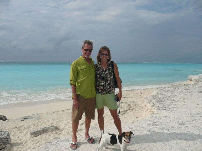 We hadn’t been listening to the VHF or the South Side Cruisers Net on Channel 18 at 7:30am and so had not been in contact with the cruising community for the last week or so. We had kinda taken a break after the constant drone experienced in G-Town. We do however have a great internet connection and have been spending some of our free time doing research and checking out what sorts of attractions Turks and Caicos has to offer for when we are underway again. This is how we met up with Byron and Polly also known affectionately as 2 gringos. They have been living here on Provo for 5 years along with their Dog, Dooley the Deranged, and writing about their experiences. I contacted them via e-mail to let them know how much we were enjoying their blog www.2gringos.blogspot.com and to let them know we would be here at the shipyard for at least another week and if they happened to be in the area to stop by and say hello. Well the very next day, they did just that. I heard Mike talking to someone in the yard and when I stepped out and saw who it was I yelled, “Hey, I know that dog from the internet!” In our conversations they described themselves as cruiser gonnabees, not cruiser wannabees and enjoyed the tour of Dancing Dolphin. They have been looking at the Gemini Cats as they want a boat with very little draft to take into vast amount of skinny water in and around the T&C. Anyway, Byron and Polly reminded us about the Net and told us that South Side Marina hosts a cruisers potluck every Thursday, and they had wanted to go check it out, so we made plans to do just that. Polly and Byron came by with Dooley and took us around to see some of the Island we had not yet checked out and then we headed back to their home overlooking the turquoise waters of the Banks and across the Wetlands next to the Shipyard. Polly made a delicious brochette and we brought some of our Blackfin Tuna and some Red Beans and Rice for our contribution to the BBQ/Potluck. We arrived at South Side Marina and enjoyed visiting with some other cruisers again. Simon who manages the Marina is extremely obliging. Talking about where everyone is headed has us ever more eager to be back out there on the water too. After the Potluck we headed back to Polly and Byron’s and continued to enjoy ourselves into the wee hours of the morning (For me a little too much), before they brought us back to the yard. We really enjoyed their company. We are honored that they invited us to spend time with them during our stay and feel we have made some wonderful new friends. Thanks Byron, Polly and Dooley the Delightful.