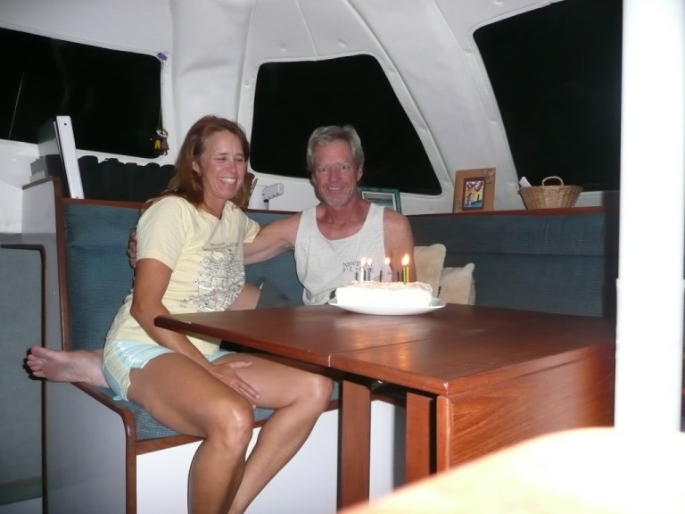 We left Rum Cay early in the morning and made our way southeast toward Mayaguana. We had light winds again still from the North which gave us a broad reach to motor sail. The swells became big again once we left the lee of the Island. We traversed most of the way in 6 – 8 ft swells but they were fairly regular at about 11 second intervals and so were not to worrisome. Mike had both fishing poles rigged and we trolled as we made our way South. Mikes ocean Rod that was a beautiful gift from the Butler Family had not seen much action since we began this journey but not for the lack of trying. At around 11:30am I had the helm and Mike was below reading and resting, as we would be sailing all night. Suddenly, Mike’s pole began buzzing and I yelled “Fish On!” and slowed the boat. I was just reaching for the pole and Mike was emerging from the Salon when the other rod also started buzzing. I yelled again “ Two Fish On!” The Autohelm steered the boat and we both got to reel in a blackfin Tuna, 10lbs and 7lbs respectively. It was a great rush! Mike cleaned the fish while we were underway and I packaged the steaks and put all but one package in the freezer. We will no longer be fish starved. Hooray! We continued on our journey and although we had a fish on 2 more times both bit through or broke the lines…..In which case it was probably better that we didn’t bring them in. The freezer is not that big. We made great time to Mayaguana arriving at 2:30am under a sky full of stars and a glowing ¼ moon hanging low in the sky. However….we arrived too early to hazard an entrance to the bay. Most of the Islands are surrounded by Coral Reef and are better approached in the light of day. We decided that since we had already traveled this far and we only had another 39 miles to get to the Turks and Caicos we pressed on. Upon entering the Channel to the T&C the changes in the colors of the water was dramatically defined. There were quite a few coral heads and we found that our GPS only covers the Bahamas so we entered using only our Paper Charts, and eyballing the Coral Heads. 28 hours after leaving Rum Cay we anchored safely on Mike’s Birthday in Sapodilla Bay on the Lee side of Providenciales in the Turks and Caicos. We ran up the yellow Q flag and I spent the afternoon baking him a Carrot Cake in our BBQ that actually turned out great! I think I’m finally figuring out how to bake in it. We had seared Blackfin Tuna Steaks with Wasabi for dinner and the Birthday Cake for Dessert. We also had a good WiFi signal and so Mike was able to Skype with Family on his B-Day. It was an exhausting but wonderful experience. We will officially check into the T&C tomorrow.