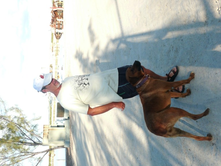 We have been taking morning walks through the community near the yard and are always greeted by numerous Island dogs. Most of these dogs all look the same, short hair, lean, floppy ears. They take their guard dog jobs seriously enough to warrant a raucous round of barking whenever someone comes near. Rusty who is on duty here at the yard is much more laid back, almost too laid back. She will come and lean on you if you stand still for very long. She has joined us on our walks and smiles now when she sees us heading for the gate. We commented that with all of the “For Sale” signs, we could be walking down one of the gravel roads in Pagosa Springs. Ok, except for the fact that we are in sandals, shorts, and t-shirts in the middle of March.