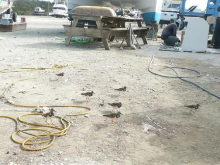 While the Crew works we are treated to a daily concert by the Yardbirds. The lineup has been inspired by the Crews hard work and include: “The Sun is Shining”, “Slow Walk”, “Gotta Hurry”, “Shapes of Things”, “Boom Boom”, “Tinker, Tailor, Soldier, Sailor”, “Bye, Bye, Birdie”, and of course, “Stroll On”. Seriously though, these little guys are Ruddy Turnstones, and they cruise around the yard and the docks. The come running and flying when there is food to be had. They have a very distinctive black and white pattern on them that can only be seen when they fly. They seek out any shade in the heat of the day, even our shadows if there is nothing else close by.