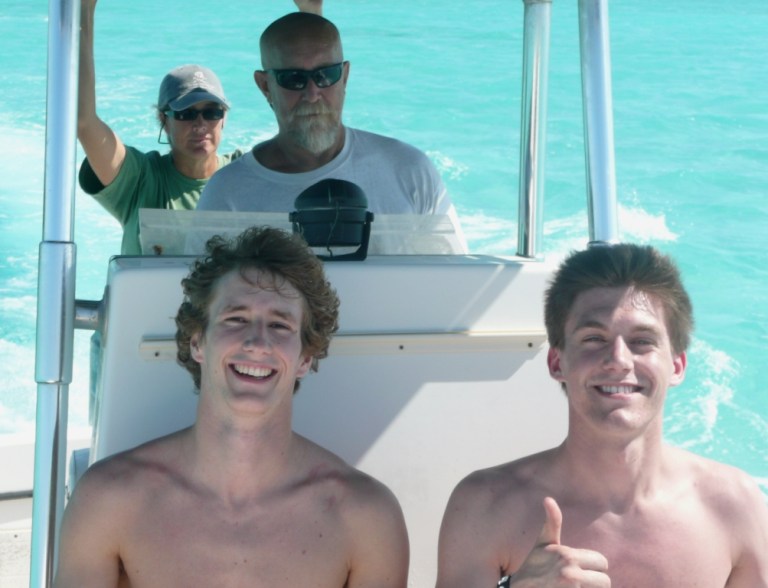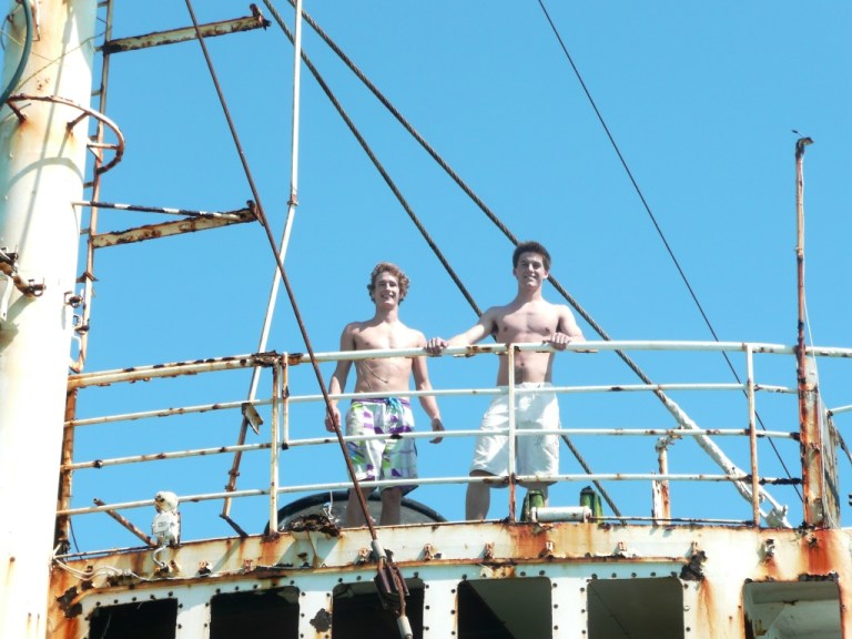 Polly’s son Ben and his friend Will were visiting from, of all places, Colorado. We felt an immediate affinity with these two terrific young men. It felt great to be back on the water. We zipped across the bay watching for shallow coral heads and enjoying the salt spray once again on our skin. Byron pulled along side a grounded steel freighter that has sat rusting in the bay for the last 5 years or so. Ben and Will with their skills in rock climbing and, using an old cargo net as an aider, ascended from the boat and scaled the side of the freighter to explore. We turned them loose with our cameras so we too could enjoy the adventure, later, over cocktails & from the comfort of a, not so rusty, deck chair.