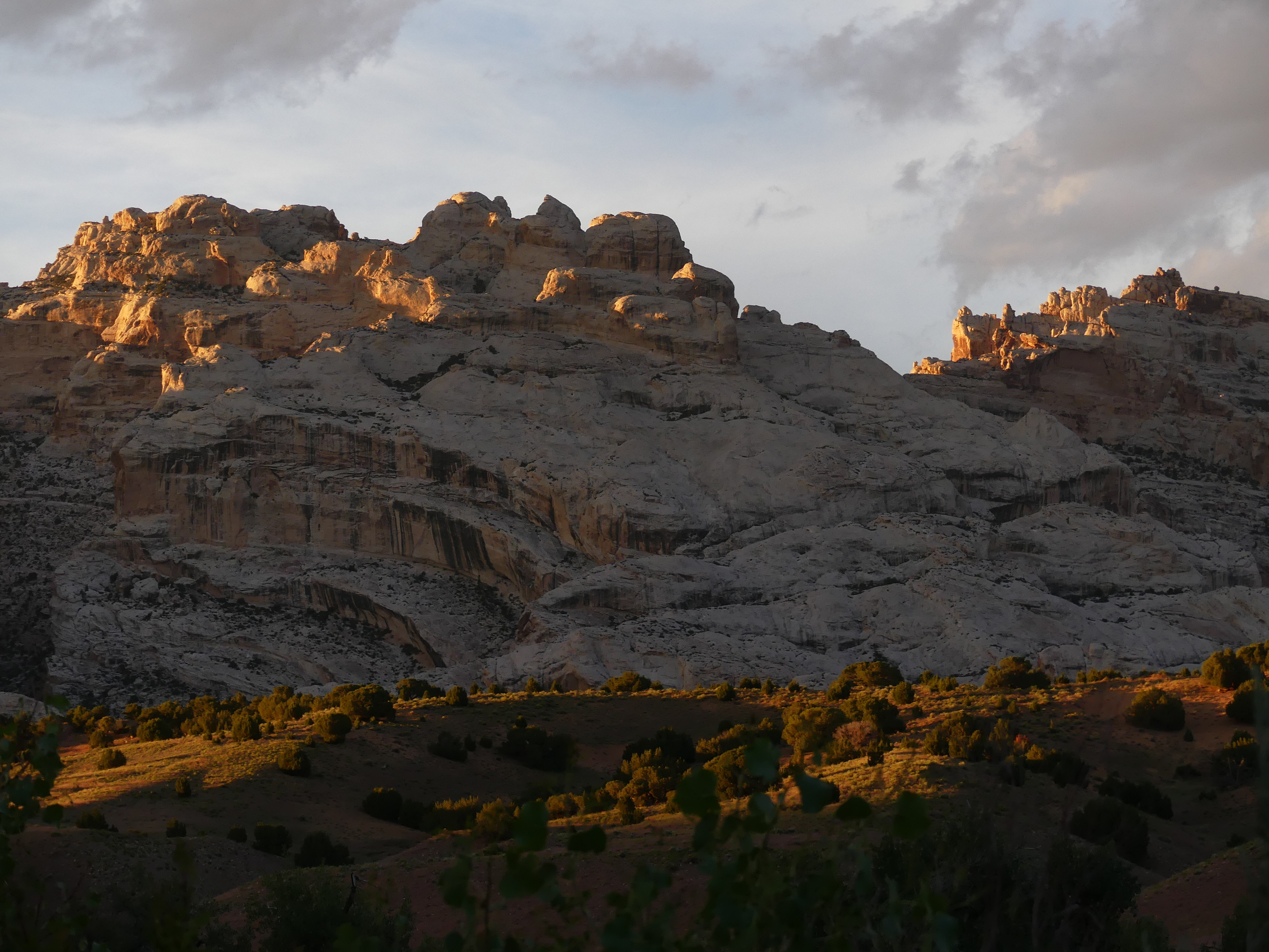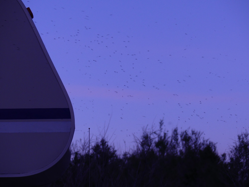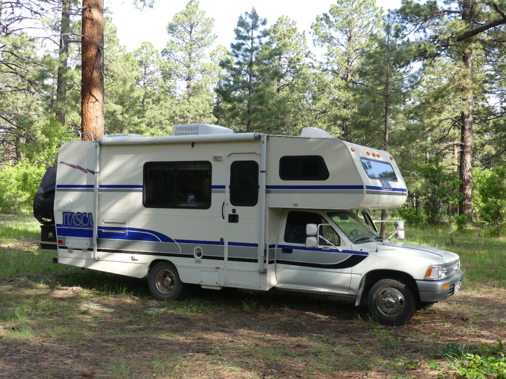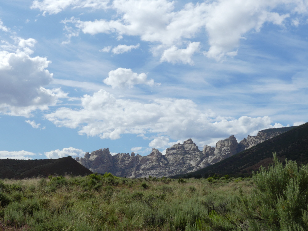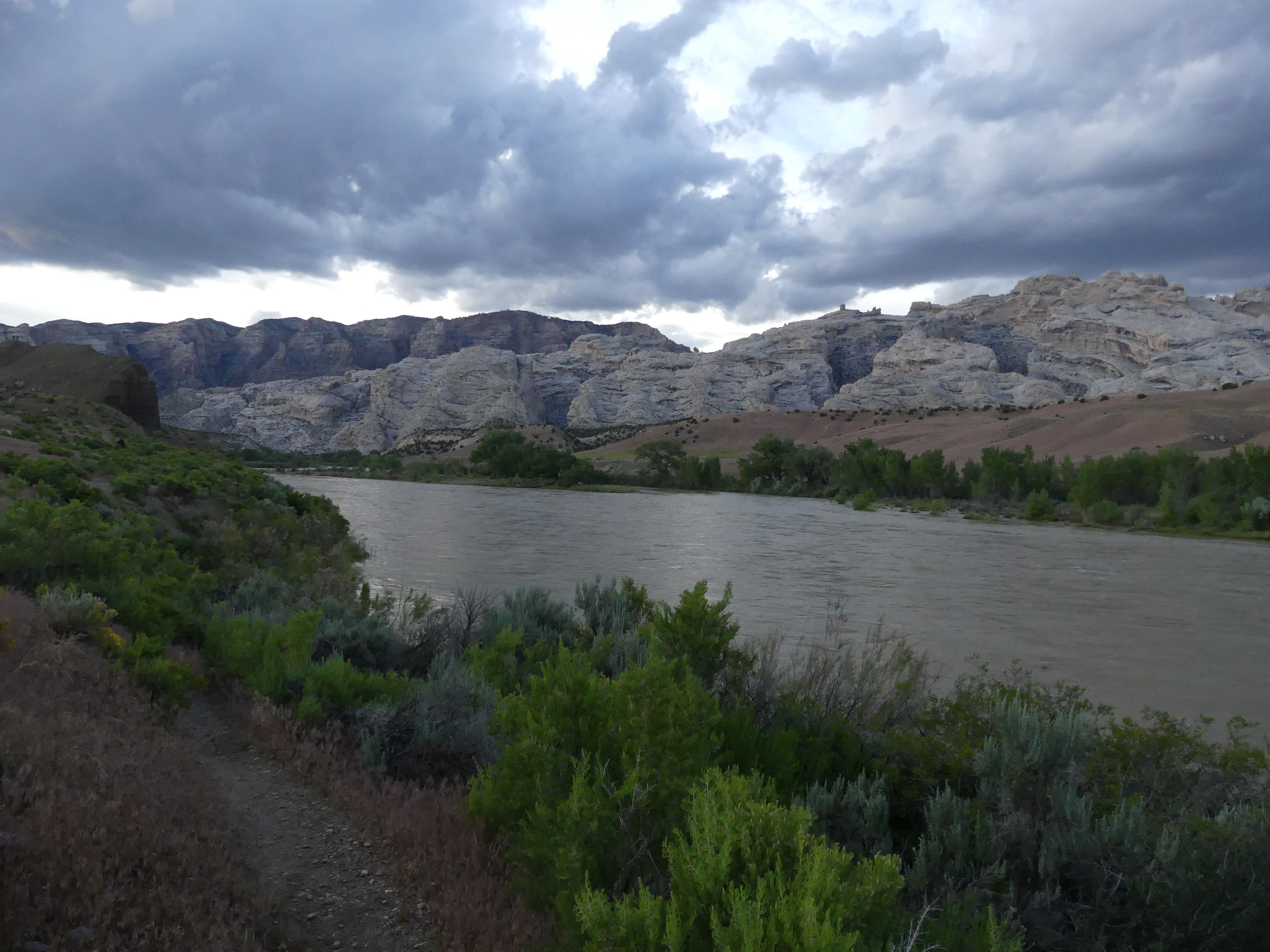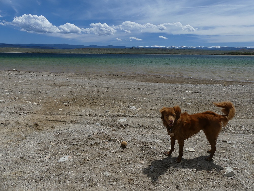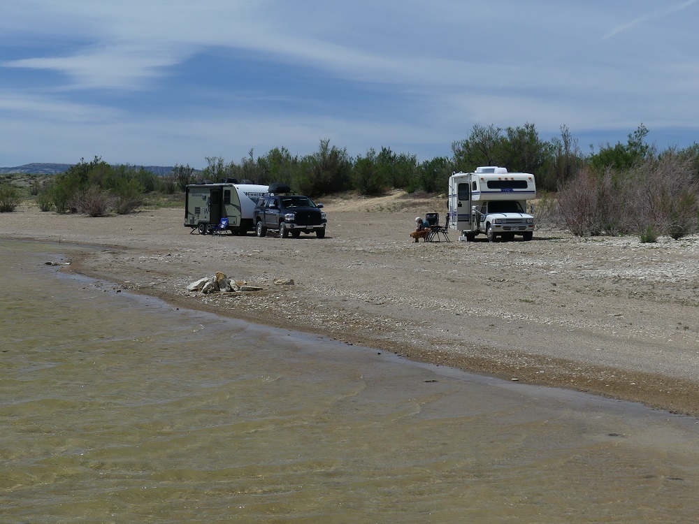 06/19/19 – Traveled north to Flaming Gorge Nat Recreation Area to spend the night. We read on freecampsites.net that there was quite a bit of free dispersed camping along the shores of the Flaming Gorge reservoir. We turned off and headed across a rather barren landscape through a maze of numerous dirt roads that all lead down to various points along the shore, some passable and some not so much. We really did not know which of these roads to take and even if we could turn around but we took our chances and were momentarily stymied when we found ourselves on a high mesa overlooking the lake. There was a very steep incline that would have taken us down to the shore from there but I couldn’t see driving our little RV or Bobs trailer down it to the shoreline. We back tracked and started down another of the maze of dirt roads on one that looked more promising albeit very bumpy, when we fortunately met a gentleman out walking who directed us to a safer, flat, graded road that we were able to take down to the shoreline without incident. Whew! After some jockeying of rigs and making sure we would not sink in the soft soil we settled in. The scenery along the shore had a desolate beauty. The sun was hot but the wind was fierce and so we were not able to put up our awnings. We slathered on the sunscreen and spent the afternoon, taking walks and throwing the ball and/or stick for Sierra who’s main passion, besides food, is fetch. As night descended we were visited by more that a dozen ghostly apparitions gliding across the lake in front of our camp. It was almost too dark to make them out but they turned out to be a flock of white Pelicans. What a lovely way to end the evening. Thanks for stopping by!