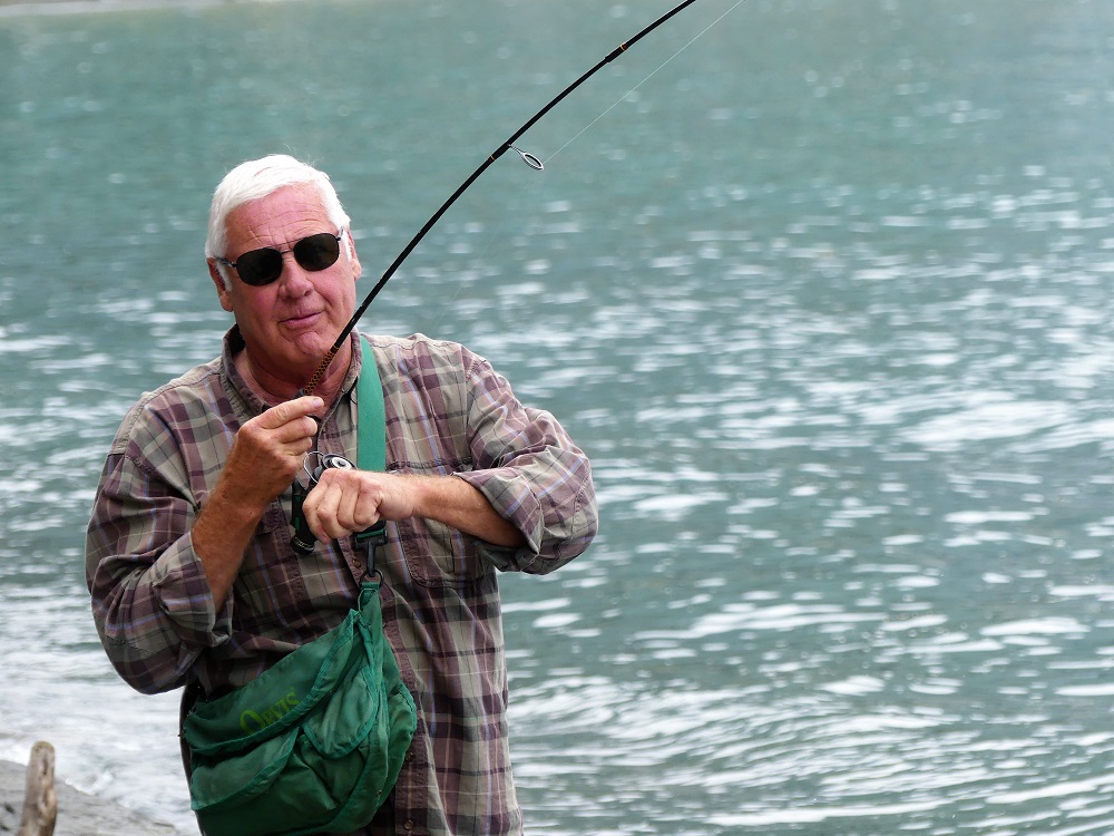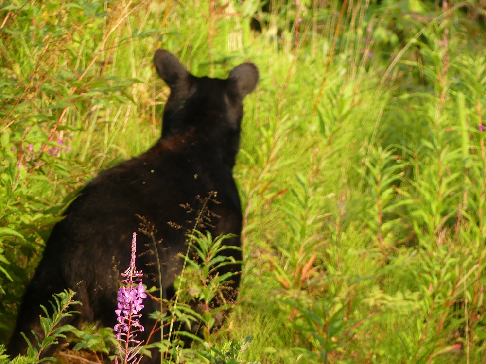 8/08 – 08/10/19 Traveling north to Cooper Landing where Jackie has friends she has been in contact with who have given us recommendations on things to do and places to fish. We camped at Quartz Creek Campground next to Kenai Lake. The campground had a very nice boardwalk that looked out over the Creek where we found a large number of Sockeye Salmon spawning. The area also seemed very popular with fly fisherman as well. We rode our bikes through the woods and took Sierra for a number of long walks and swims in the Lake. Jim and Jackie got to do some gold panning in this area and found a little color! We enjoyed a really good meal at the Sunrise Inn where Jackie’s friend works. She was really great and set us up with Lures we could use to do some “Flossing”, a way to catch salmon who do not eat when they are traveling upstream. We followed her suggestions and after a missed turn and a slight detour of about 10 bumpy miles we arrived at the location she suggested only to find new signs posted “No Fishing”. Not to be deterred we pulled off the road on our way back to the campground where we had seen some other people fishing across the river and proceeded to enjoy ourselves as we caught a few Coho salmon. We took a drive another day and hiked up to the Russian River Falls where we found a massive amount of Salmon at the base of the falls trying to make their way upstream. It is amazing to watch them make these really big leaps up the falls through rushing water and even more amazing is that many succeed. On the way back from our hike we stopped again at our same fishing spot. We were told by some other fishermen that showed up that there was a brown bear up the road fishing in the river. We hopped in the truck and headed that way. Mike was able to Snap a couple of pictures but I only caught his backside heading into the woods. (Seeing a Grizzly in the wild is still on my bucket list). We still have a ways to go and places to see. I am not discouraged.