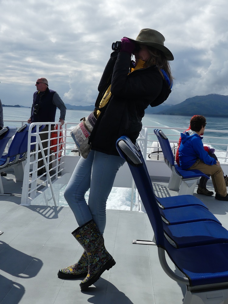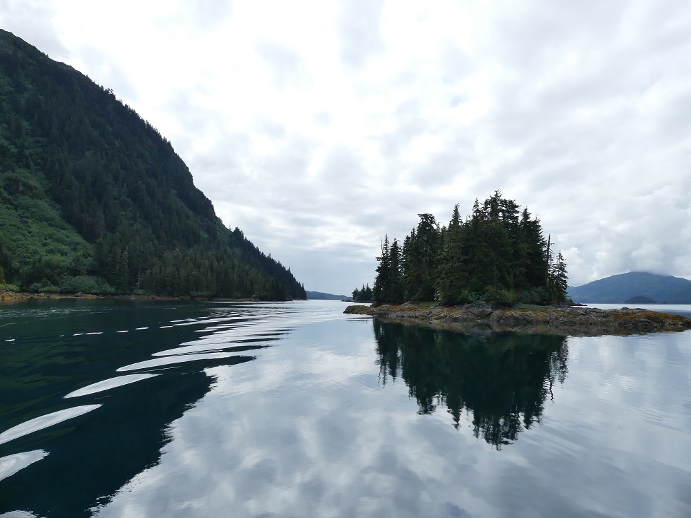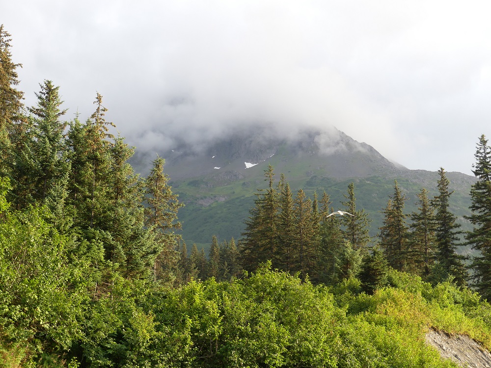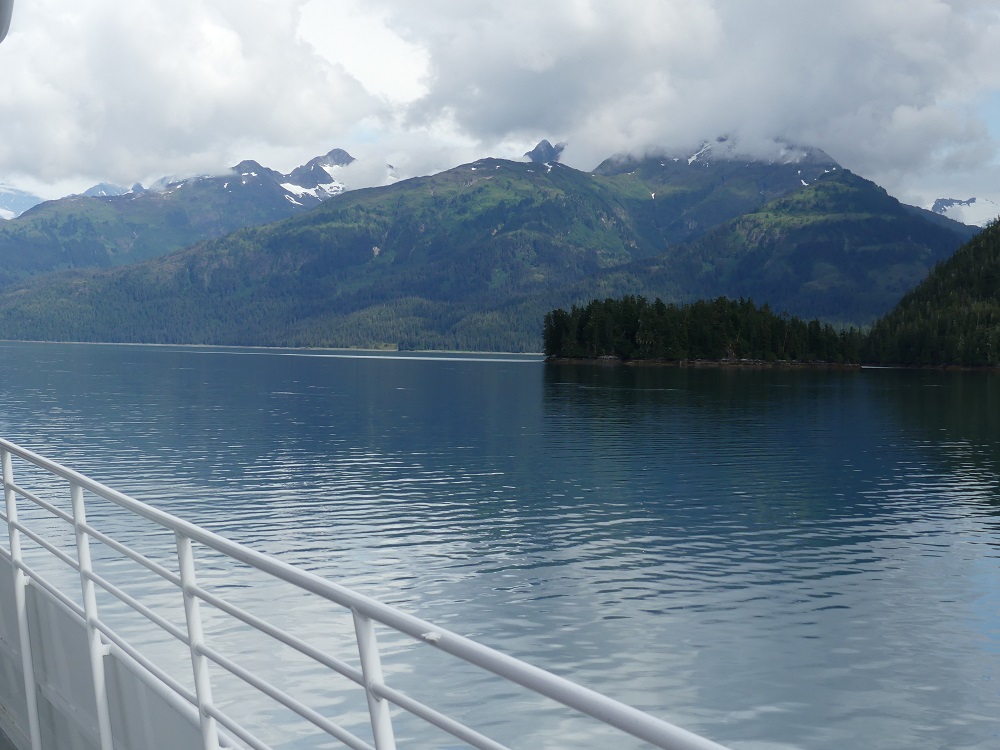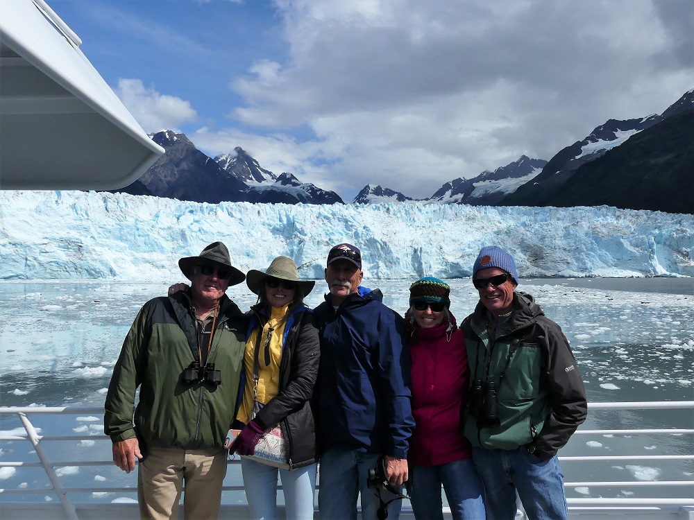 07/28 –08/02 Bob headed out early to get his Radiator repaired in Anchorage. J&J will be meeting with their friends Greg and Becky at an RV Park in Anchorage and we were headed to what we thought might be a campground on the outskirts of Anchorage called the Kincaid project but when we arrived we only found a large parking lot next to a dog park and a paintball park and no campground. We opted to drive down toward the town of Whittier as there are a couple of USFS campgrounds that offer good bicycling and hiking opportunities. We were delighted to find the wonderfully maintained, clean, paved, and spacious sites at the Williwaw campground. It has a Salmon viewing platform over the Williwaw creek which we checked daily and finally saw some red sockeye salmon swimming upstream to spawn. There were numerous nature trails to hike and bike on. With his new radiator in place, Bob joined us a few hours later. We rode our bikes and made plans to ride the Alaska railroad on a day trip out of Whittier, AK. J&J along with their friends, who came along for a day trip, joined us at the campground along with their 2 king Charles spaniels the next day. We all enjoyed a walk out to the Begich-Boggs visitors center on the Northwest Shore of Portage Lake. From this vantage point we could see 5 different glaciers surrounding us. The visitors center was very interactive and had many hands on exhibits and Audio, visual, cultural, and historical displays. It also had a beautiful and informative film on the natural history and culture of the area. As the filmed ended the screen lifted in the theater and a curtain opened to windows looking out over a stunning view of the lake and glaciers. Very well done! We really liked all this area had to offer and so kept extending our stay. We rode out bikes out to Moose Junction (no moose) and then picked up Sierra and gave her a run on the trail out to Byron Glacier. On our final day there, we loaded up our Camper, aka the party bus, with all 5 of us and 2 dogs and made the drive through the longest train/single lane vehicle tunnel 2.4 miles through the mountain to the deep water port of Whittier where we spent some time exploring the town. We left the dogs in the camper and boarded the train for the round trip scenic ride back through the tunnel and through the mountains past Spencer Glacier. At our turn around stop at Grandview station we paused for a bit to stretch our legs and pick wild blueberries. We did not have much luck seeing wildlife but did enjoy the ride and the scenery. Upon arriving back in Whittier, the Dogs were happy to see us and we made our way back through the long tunnel for the 4th time to the Willwaw campground. We all agreed this was a wonderful place to call home for a few days.